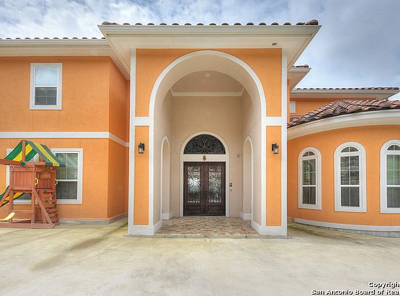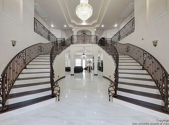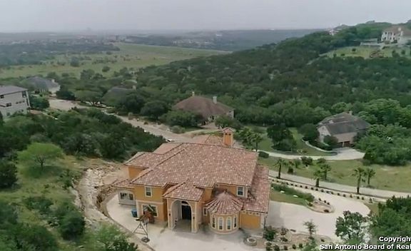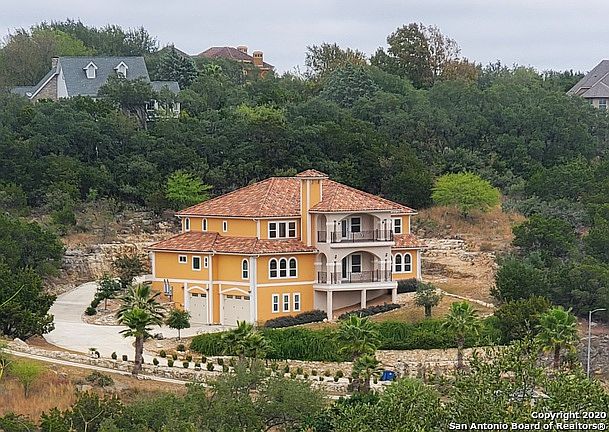 Enjoy private, luxury living within the guard gated Stone Oak community of The Estates of Champions Run. Stunning hillside views from the first and second level balconies are unmatched, providing a gorgeous backdrop for elevated everyday living. A magazine-worthy entryway immediately greets guests through large dual entry doors, where a wrought-iron double staircase and sparkling chandelier wows all who enter. Entertain at any scale within the dual living areas or formal dining room, punctuated with elegant details such as sleek tile floors, a neutral color palette, high ceilings, rich crown molding, and stately columns. The modern, island kitchen is fit for any culinary adventure and provides a gas range, veggie sink, unique tile backsplash and accents, as well as ample prep and storage space. The sumptuous owner's suite is a fabulous retreat to relax and unwind, featuring a coffered ceiling, corner fireplace, and luxurious spa bath with both a Jacuzzi tub plus a tile, walk-in shower. Five spacious secondary bedrooms complete the home's accommodations and allow flexibility within the floor plan. With too many amenities to feature here, come tour this unmatched estate in person today.