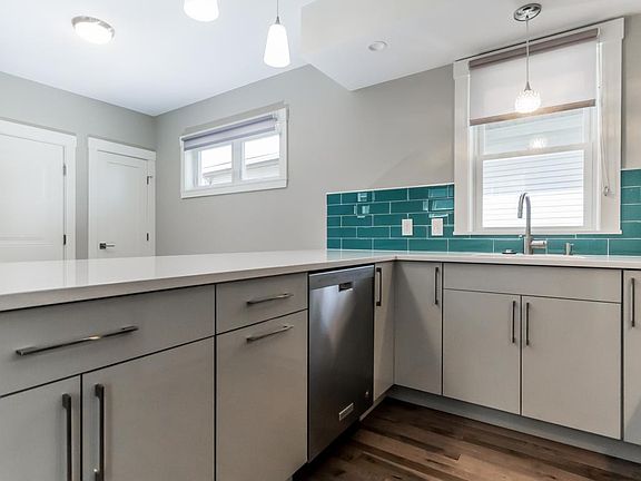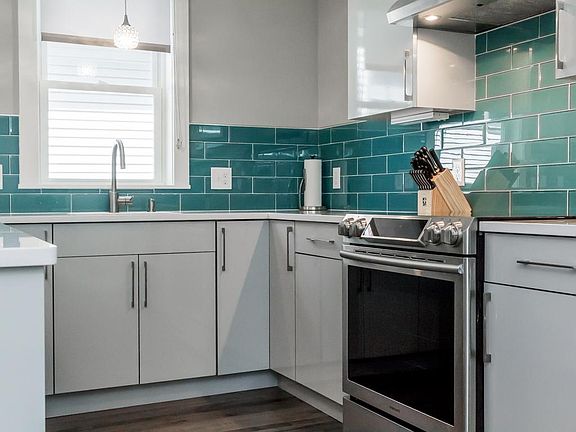 Waterviews of casco bayQuartz countertopsAwning windowsTile floorsStainless steel appliancesAquamarine glass backsplash tiles