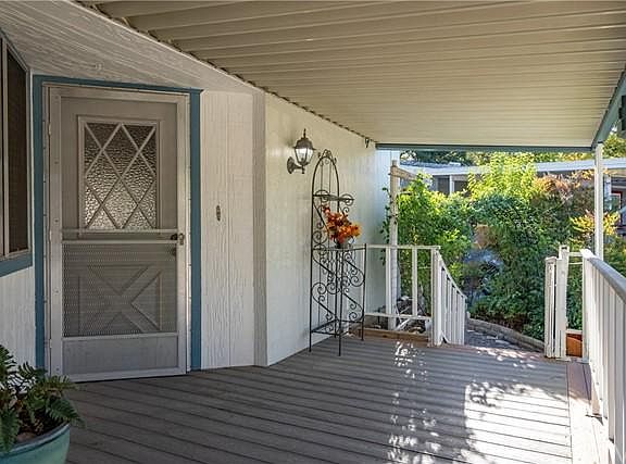 Rare opportunity in the Ranch Paso senior community. This 2 BR 2 Bath home also boasts a room addition, a spacious 2 car garage and land owned with permanent foundation. Kitchen with breakfast bar opens to a second family room. Indoor laundry room with office space included. Large covered porch with breeze way leading to the garage. This large and unique lot backs up to the creek with sitting area and neatly landscaped and low maintenance with rocks and lots of plants providing greenery and color. Rancho Paso offers heated pool, club house, two small parks and lots of mature trees and is conveniently located. Welcome Home!