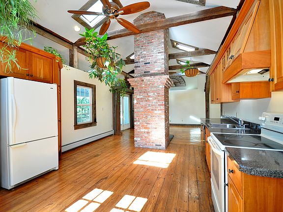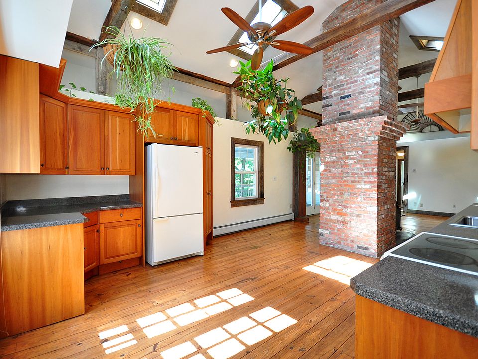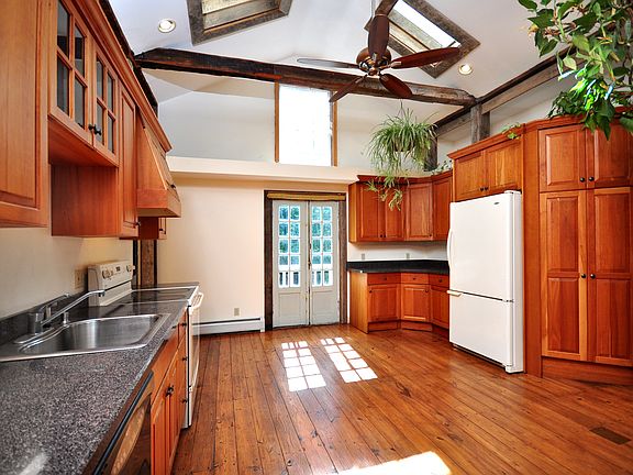 High end rustic apartment in historic farmhouse in the Unionville section of Farmington. Two bedrooms with two full baths, master bath has large double shower, marble and granite with double shower heads and double sinks. Exposed beams and brick with center chimney and wood burning stove. 8 skylights, 4 ceiling fans, original wide chestnut flooring, cherry cabinets, built-in wine rack, stove, refrigerator, and dishwasher, washer dryer hooks ups in laundry room/mudroom. Apartment has been recently renovated with new thermopane windows and is extremely well insulated. Huge storage room/attached attic space, walk in closets. large covered porch and private deck. Perennial flower gardens, lots of woods and privacy. Quiet country setting friendly neighbors. Uconn health center and rt 84 close by. Please DO NOT EMAIL, Please call for additional information or to schedule a showing. (860) 810-3452