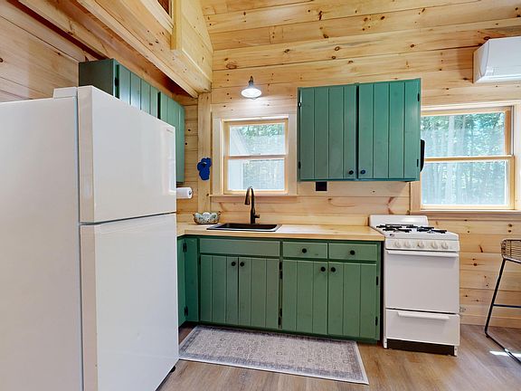 The interior features cathedral ceilings, knotty pine walls and ceilings, built-in shelves, and furnishings that remain add to the cozy charm. The 1 bedroom with a loft and full bath with laundry hookup ensure comfort and functionality.