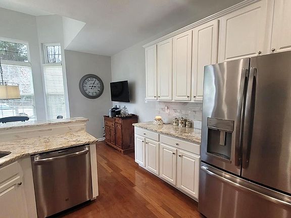 Bright & Airy this very special offering, 3 bedroom, 2.5 bath townhome in desirable Gatherings @ Lawrence will delight .From the moment you enter you can’t help but appreciate the attention to detail that this lovely home affords. The updated kitchen boasts 42 inch white cabinets with premium granite countertops, deep sink with gooseneck faucet. The stainless steel appliances include a French door refrigerator, dishwasher and 5 burner oven. Plenty of cabinets and counter space. Enjoy your morning coffee in the open eat in kitchen that has windows that bring in the morning sun. The contrast of the neutral colors and wood flooring and many recessed lights allow for a great backdrop for interior furnishings. The spacious open dining room offers a tray ceiling perfect for fine dining. The living room boasts a gas fireplace that brings warmth to your space. The first floor primary bedroom suite is perfect respite with walk in closet and full bath. The shower has several water jets to enhance your showering experience. The first floor second bedroom can be used as a den , home office or hobby room. Powder room and laundry room , plenty of closets and storage plus one car garage. Enjoy sunlit afternoons on the patio that has an awning for shade and backs to woods for privacy. The upstairs en suite is perfect for guests with living room , bedroom and full bath. Added closet in the living room increases storage. The walk in attic adds additional storage, and harbors the HVAC . Enjoy the many bonuses and space this lovely home affords . Move right in!