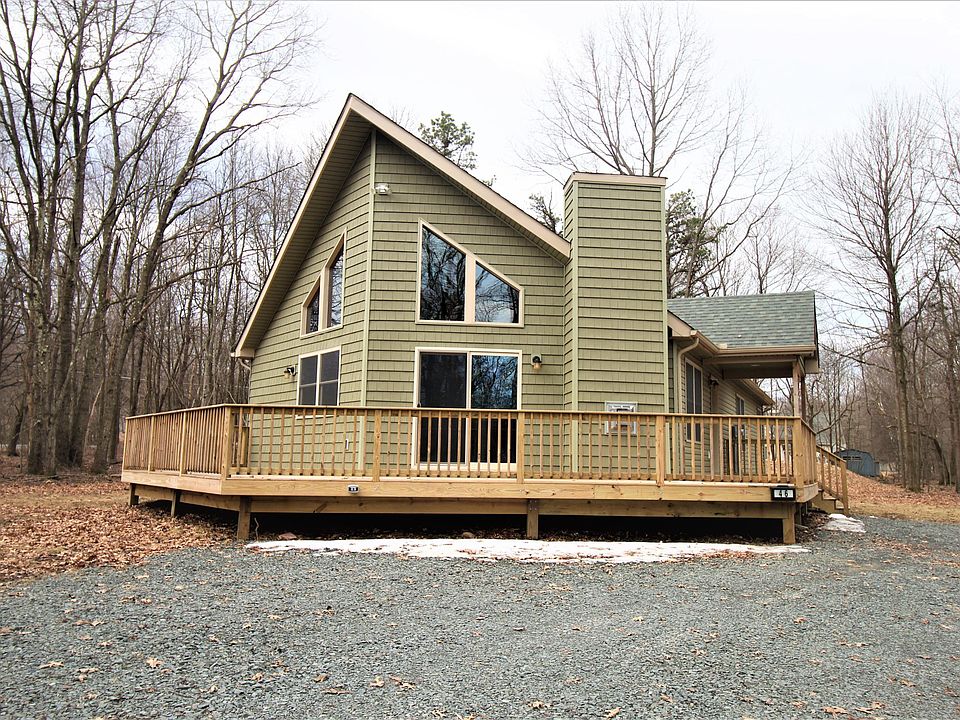 This 3 Bedroom, 2 Bath Chalet is beautiful! Featuring a great location, high ceilings in the living area, a great Living Room, Dining Room, Modern Kitchen, dedicated laundry/utility room, a massive master with its own walk in closet and master bath! The loft is great, and overlooks the Living Room and Dining Room, taking full advantage of the great natural light! Only minutes to the beach, this house is the perfect Pocono Getaway! Extras included with this property are Hydronic Electric Baseboard heat, Vinyl Shake siding on the front and chimney, Granite counter tops in the Kitchen and Bathrooms. Ceramic tile in both bathrooms and laundry room, Cathedral ceilings in the master as well as a double sink in the master bath.