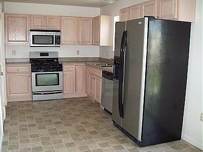 Eat-in-kitchen with new stove, refrigerator, dishwasher, microwave, pantry, sliding doors lead to large deck.Master bedroom with large closet and full bathroom, new wall to wall carpet throughout, large finished daylight basement, small fenced yard, 2 car garage, 1st floor washer/dryer hookups (washer/dryer negotiable). Gas heat and central air. No pets.