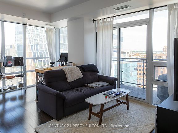 Sunny, bright, floor to ceiling windows. South East exposure. Balcony covering full length of living room. Excellent downtown location. 9 feet ceiling, 6 years new unit. Owner relocating and some furniture-island, TV, Sofa, bed frame- can be included in purchase. Includes bike storage locker. Please note that gym in the building being updated.