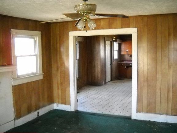 Exterior Features: This is a 4br/2bath single family home. Exterior looks to be in fair shape. Siding is beige in color and is in fair shape. Windows are wood framed and are intact. The roof needs work in certain areas. Foundation is wood on concrete. There is a front porch attached to the house, it is in decent shape. No garage, no driveway. Interior Features: The interior of the home needs work, but is manageable. There are water spots in the ceiling, and some parts of the floor are sagging. Living room has green carpet, wood panel walls, and white trim. The kitchen has linoleum flooring that needs work, cabinets are in bad shape, no appliances preset, but counter-tops and sink are intact. Bedrooms are all similar in styling and in condition: green/blue carpeting in decent shape, walls are tan, and trim is white. Both bathroom are complete with tub, toilet, and sink. Mechanics include hot water heater, fuse box, and power meter.