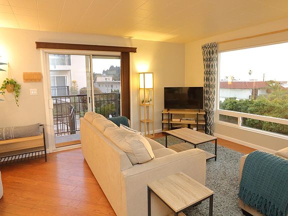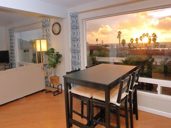 Newly renovated complex! Sit-down ocean views from a 2 bed / 1 bath first-floor condo in Del Mar Village. Available starting February 1 for a minimum 6 month lease. Year-round sunsets from the couch or dining table; walk to beach-break and reef-break surfing; hardwood floors; granite/quartz countertops; ceiling fans; luxurious soaking-sized bathtub; fully equipped kitchen including Keurig, blender, toaster, cookware, and tableware. Assigned storage area fits surfboards and bikes. Quiet complex with pool, laundry, and parking. Easily walkable to all of Del Mar's restaurants/shops, near 101 bus stop, and quick drive to many parts of San Diego, including UCSD. Owners live nearby for any issues. The condo is currently fully furnished as pictured, but can be unfurnished to your needs. Internet, cable, water, trash included. Tenant pays for gas & electricity. One assigned parking spot, with additional guest spots available in the complex. Laundry is shared, but within the building. Small pets okay with reference (max 2 allowed per HOA regulations). No smoking.
