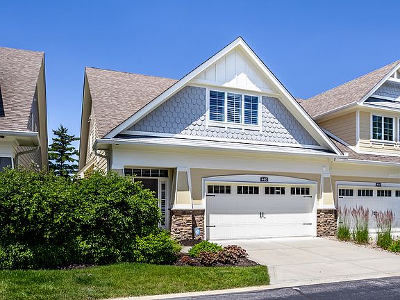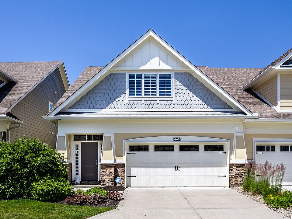 This charming condo, nestled in the highly sought-after Cottages of Carmel, captures the essence of Craftsman-style architecture in a low-maintenance community. With its quaint ambiance, this residence is ideally located just minutes from Carmel's vibrant attractions, including the Arts & Design District, the Monon Trail, a plethora of restaurants, unique shops and galleries, the Palladium, and the bustling Carmel Farmers Market. Whether you prefer walking or biking, everything is within easy reach. Built in 2017, this condo offers a spacious and well-designed layout with the primary bedroom and ensuite conveniently located on the main level, providing easy access and privacy. Upstairs, you'll find two additional bedrooms, each with its own private bath, as well as a den that is open to the main level, creating a seamless flow throughout the home. The dining area features a custom space-saving window seat, perfect for cozy meals and additional seating. The kitchen boasts elegant cabinets with crown molding, granite countertops, and a Blanco farm sink, combining functionality with style. The living area is enhanced by custom built-in bookcases that frame the gas fireplace, adding both storage and charm. Throughout the condo, custom shutters provide a polished and cohesive look. The main level also houses a generously sized laundry room, offering convenience and ample space for all your laundry needs. This thoughtfully designed condo ensures both comfort and style, making it an ideal home in the desirable Cottages of Carmel community. Experience the best of Carmel living in this delightful and meticulously maintained condo community.