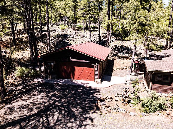 WOW...Beautiful cabin nestled in the Ponderosa Pines sitting on over an acre of gorgeous property! The main house offers 1426 sq ft with 4 sizable bedrooms and 2 bathrooms, large open great room with cozy fire place and beautiful wood beams! Kitchen is large and has a nice eat in dining area, white appliances and tons of cabinet space! There is a 188 sq ft studio with a bathroom behind the detached 2 car garage. Perfect for a guest quarters or a private office! Outside you will love relaxing & entertaining on the large covered patio enjoying the great outdoors! Located directly across the street from Pinewood Country Club there they offer so many amenities for you to enjoy including Golf, Restaurant, kids club and more! Come see what this amazing home has to offer! You will FALL IN LOVE!