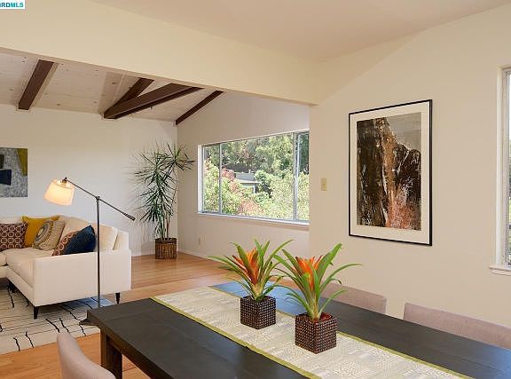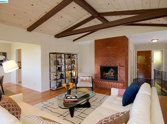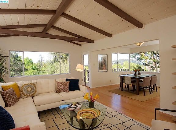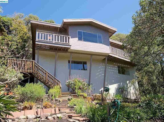 Set back off the street, this spacious two-level midcentury home offers a wonderful, serene setting with splendid oak trees and views of the bay. Main Level:* Three bedrooms, two bathrooms* Master bedroom with two closets and sliding doors to balcony with views* Spacious living room with wood-beamed vaulted ceilings, fireplace, balcony and views* Dining room with views* Large kitchen/family room combo with access to side yard* Laundry area* Refinished hardwood floors and slate entry Lower Level:* Spacious rumpus room that overlooks the rear garden and verdant landscape* Bonus room that could be used as a 4th bedroom/office* Small workroom with sink Other Features:* Approx. 2,739 sq.ft. of living space (per public records)* Approx. 9,520 sq.ft. lot (per public records)* Two-car garage with interior access to main level* Side yard planting area with sink* Close proximity to Colusa Circle and Kensington Village