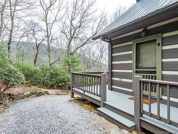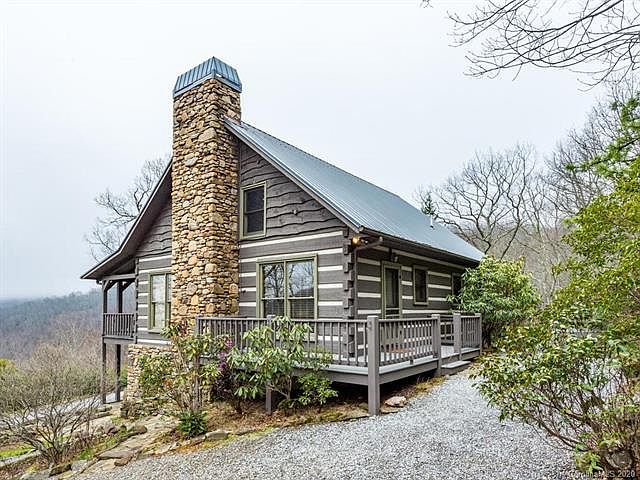 AMAZING OPPORTUNITY OFFERED BELOW TAX VALUE: "EAGLEVIEW" RETREAT - MILLION DOLLAR VIEWS FOR LESS THAN HALF THE PRICE! Charming cabin perfectly placed on 4.66 gorgeous acres! A beautiful blend of log & stone beneath newer metal roof creates a lovely exterior w/ rustic appeal. Rock yourself into a state of bliss from the covered front porch w/ glorious sweeping views cast majestically before you. Warm, woodsy interior is both vast & cozy. Open floor plan hosts kitchen, living room & dining area beneath a grand vaulted beam ceiling & walls of knotty pine centered around a stunning stone wood-burning fireplace. The kitchen boasts gleaming granite countertops, new stainless steel appliances, huge kitchen island, an abundance of well-crafted wooden cabinetry & fine lighting fixtures, including a hanging Tiffany lamp. Large master on main. 2nd guest bedroom & bathroom in finished basement area has lower level entrance. Loft area provides extra living space. Only 20 min to downtown Asheville!