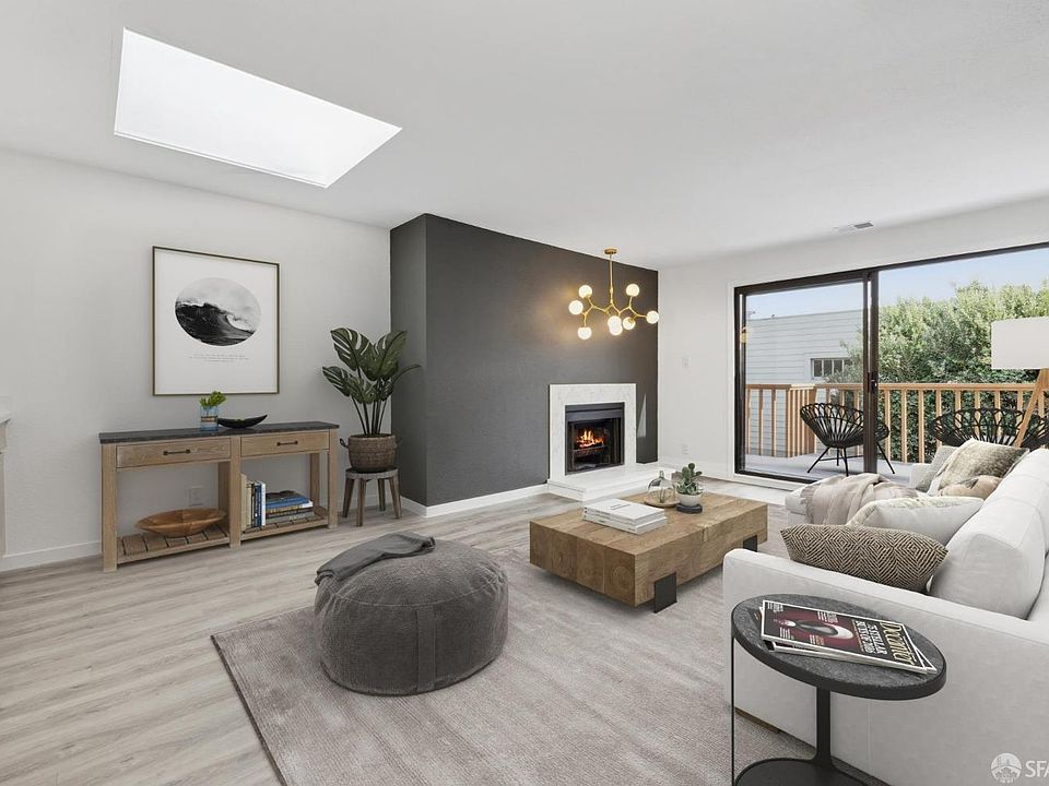 This thoughtfully designed & recently renovated, 1500 sq ft top-floor flat is situated in a boutique 3-unit association and features 4 skylights throughout. The exceptionally large master bedroom boasts an en-suite bathroom & a beautiful west view of Twin Peaks. A spacious second bedroom doubles as an ideal home office, with quiet surroundings & natural light from the interior atrium. The kitchen comes complete, outfitted with luxurious quartz countertops, stainless steel appliances, & beautiful wood cabinetry. The breakfast nook opens directly onto a large, private, east-facing deck, accessible from the nook and the living room, overlooking a spectacularly manicured shared garden. The living room is perfect for entertaining guests by the stylish wet bar, or for evenings by the wood-burning fireplace. The seamless flow between dining room, kitchen, & living room allows for serene views of the greenhouse window overlooking the atrium. Included are an in-unit washer & dryer, generous closets, & storage spaces throughout. Secure deeded garage parking with extra storage space for bikes, strollers, & more. Ideally located within walking distance of Hayes Valley, Alamo Square, & Lower Haight, offering some of the best dining, shopping, & art the city has to offer. Great for commuters!