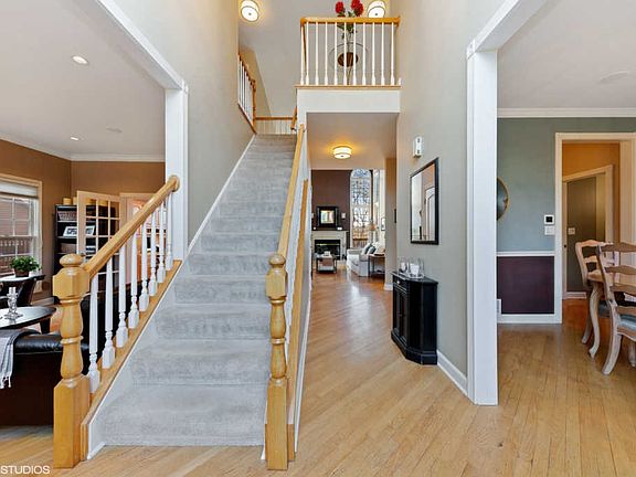 This beautiful 4 bedroom home situated on .35 acres east of the Fox River is a unique find! This home is bursting with added features and amenities including a newer remodeled kitchen. The kitchen is perfect for large gatherings with its large island and spacious eating area. There's lots of storage and organizational space in the upgraded 42 inch maple cabinetry with the added features of a large pantry, pull out drawers, pot racks, and even a magnetic board and side storage. No thought was overlooked in the design of this kitchen! Beauty meets functionality with recessed lighting, granite counter tops, stainless steel appliances and hardwood floors. The 16-zone speaker systems pumps music throughout the house and to two theater setups via the internet. The separate dining room provides more seating for large gatherings. The flow from the two story family room with gas fireplace to the den through elegant french doors is seamless. Working in the den/office will be convenient with lots of built-ins and light flowing in from the large back window. You'll love the extra seating space the living room offers connected to the office by another set of french doors. Upstairs you'll find four spacious bedrooms including a gorgeous master suite with well-lit sitting area, huge walk-in closet and master bath with double vanity, whirlpool tub and separate shower. The finished walk out basement features a beautiful finished space with a built in 7.1 surround sound theater system and 58 inch plasma television. The entertainment area flows into the wet bar area with island seating and mini fridge. There is still plenty of space for table games, gym equipment or a kids play area. Basement has separate zoned climate control. Outside the walkout, is a three season room- perfect for enjoying the outdoors in between seasons. The beauty of the home doesn't stop indoors. Outdoors, the home is surrounded by beautiful mature oak, maple and walnut trees. The expansive Trex deck spans the back of the house with access from the kitchen with lots of seating areas and space to grill. Below is a beautiful flagstone patio with firepit. A tranquil water feature and professionally installed uplighting gives a peaceful ambiance. The beauty of this property is a sight to behold and where you will want to spend a lot of your time. You have the added convenience of a multi-zoned irrigation system, NEW Roof, NEW siding, trim, and gutters! Area amenities include a bike path across the street linking Holder Park to Presidential Park with its playground and prairie paths. Available lot which goes to the river and includes a garage with loft and covered pier with boatlift for an additional $125,000. MLS# 10889865