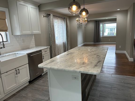 Beautifully updated 1st floor of a 2-story home on a quiet tree-lined street. Spacious open layout includes a bright living room, dining room and stylish modern kitchen with crisp white cabinets, island seating and lots of cabinet and counter space. A tastefully updated full bath and 2 bedrooms round out the 1st floor. Access the ample deck and spacious green backyard through sliding glass doors w/ built in shades where you'll find plenty of serene and private space to enjoy the seasons. The fully finished lower level has lots of additional living space plus a large dressing room that could turn into an office or craft room. A newer washer & dryer are also in the basement as well as a powder room. Exclusive use of the driveway. Tenant responsible for landscaping and snow removal. Credit check, verification of employment/funds, real estate fee and 1.5 security deposit required. Lease 1 year or +. Tenant responsible for snow removal and all utilities except water. Use of Yard, Basement and Driveway. No smoking or pets.