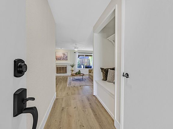 Step into this meticulously upgraded home featuring newer luxury vinyl plank flooring throughout. The inviting entrance boasts a cubby sitting space ideal for bags, shoes, and extra storage. Enjoy a light and bright floorplan with a stunning kitchen showcasing white cabinets, granite counters, a breakfast bar, and newer upgraded stainless steel appliances. The dining space opens to the backyard through double doors. Both the primary and hall bathrooms have been beautifully renovated. New interior doors and window shutters enhance the elegance of each room. The finished garage, complete with a wall A/C unit, ceiling fans, extra storage, and epoxy floors, offers versatile use. The backyard is perfect for entertaining with a playground space, a newer concrete pad, a large pergola, and a dedicated BBQ area. Additional upgrades include a newer roof, newer HVAC, Copper plumbing, and new sewer line to street,