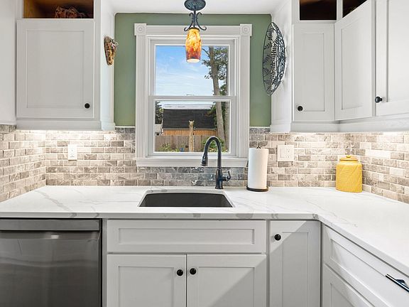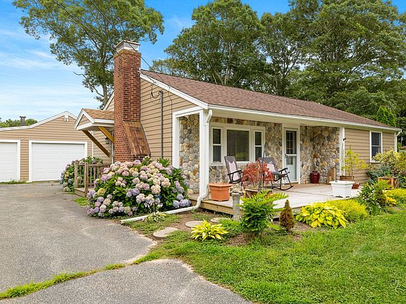 Don't miss out on this updated 2 bedroom 1 bath home with detached 2 car garage, covered front porch offering comfort, convenience and more. Sparkling kitchen with recessed lighting, white cabinetry with quartz countertops, beautiful backsplash, center island with oak counter, Jenn-Air range with gas cooktop, pendant lighting and built in dining nook. Stunning renovated bath featuring recessed lighting, subway tile walk-in shower with frameless glass doors and stylish accents, tile floor, and custom vanity with quartz top and bowl sink. Also includes a smart bath fan with alexa to control lighting and play your favorite music. Primary bedroom is spacious with recessed lighting, and beautiful built-in shelves and drawers. The second bedroom (currently being used as a den) overlooks your own backyard paradise with slider and direct entry out to a private deck and an amazing backyard. Landscaped with fruit trees and berry bushes, raised garden beds, beautiful perennials, a wooden garden swing, or practice your golf swing. Full basement, Central A/C and on-demand hot water. A true Cape Cod home value! Seller welcomes offers with requests for buyer concessions.