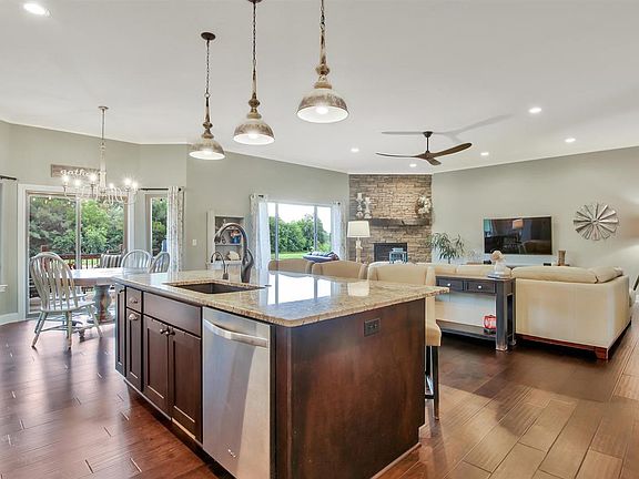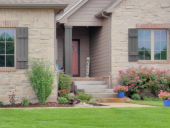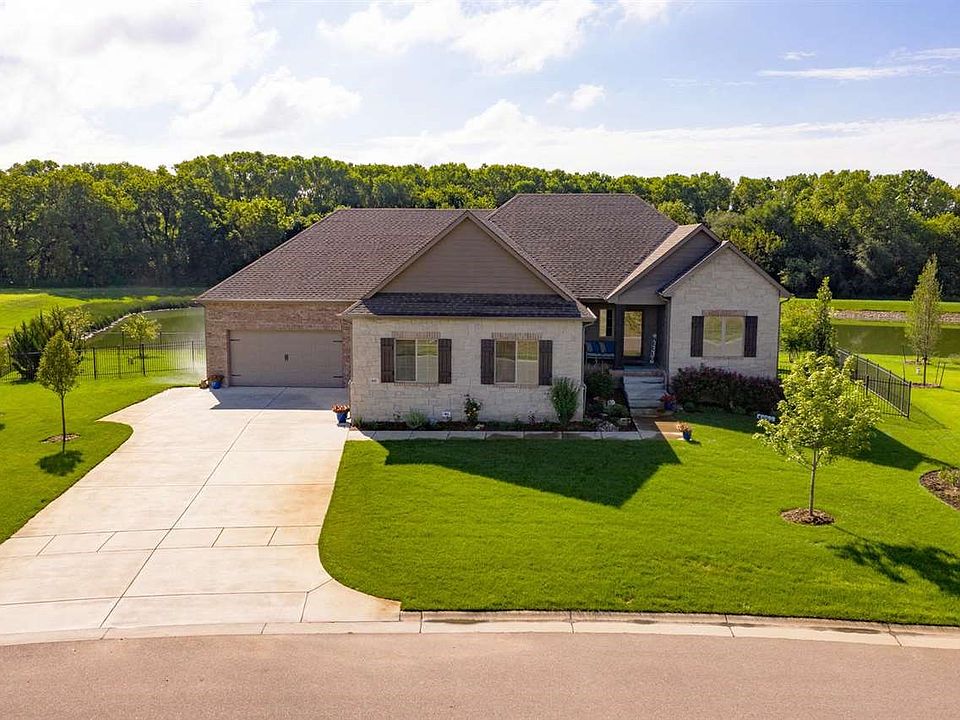 Donât miss this truly custom home in Valley Creek Estates, with the small town living of Valley Center, KS. This beautifully maintained 4 bedroom, 3 bath home will capture your attention as you walk up to the front porch and into the spacious foyer with 10 ft. ceiling and crown molding throughout the large living room, dining room and, kitchen. The living room features a stone fireplace with a distressed custom mantle. The dining room opens to the east-facing covered deck and the highlights of the kitchen include a large island, granite countertops, tile backsplash, gas cooktop, stainless steel appliances and, walk-in pantry. The Large Master bedroom boasts a tray ceiling, crown molding, a ceiling fan and a lovely view of the large pond behind the house. This spacious room features two walk-in closets and easy access to the main floor laundry room. The Master bath includes a custom tiled walk-in shower, a separate water closet, split vanities with granite countertops, a large linen cabinet featuring an interior electrical outlet! The view-out basement offers a large open family room with a gas fireplace with a stone surround, custom distressed mantle that draws the eye, an impressive wet bar with granite countertops, an abundance of storage cabinets, space for a full-sized refrigerator, and a game table area. Both of the bedrooms have walk-in closets. The over-sized insulated four-car garage, with a water source to wash vehicles or pets, and the bonus room are perks of this spectacular home. The bonus room has separate heating/cooling system and could be used as an office, den, man cave or theater room. The yard is low maintenance with a well and sprinkler system, wrought iron fence, and an oversized concrete patio. The seller has added trees and flowers to enhance the natural beauty of the lot. Donât forget the great view of the pond and tree row seen from the backyard hot tub! There are too many upgrades, amenities and features to list here!