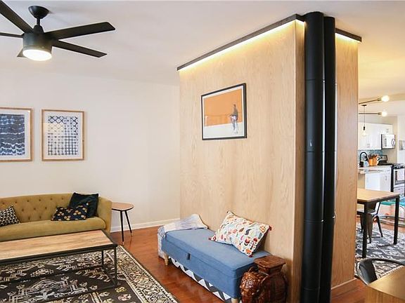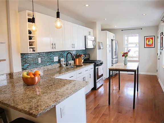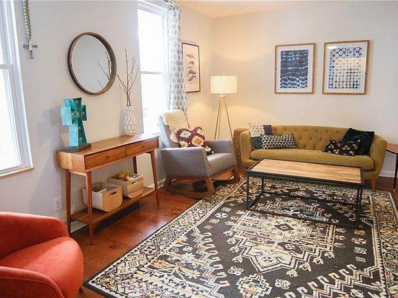 Architect owned and renovated home with tasteful finishes. Newer and updated kitchen that opens to a large dining room and then a living room on the first floor with hardwood floors throughout. Kitchen is bright and open with stainless steel appliances and custom oak shelving. 1st floor half bath. High ceilings & large windows make the home feel bright and airy. Four bedrooms and two full baths on the upper levels. Plus a second floor family room and laundry area. 2nd floor balcony off of one of the bedrooms. 3rd floor skylight and hatch access to the roof. Newer high quality designer light fixtures. Central AC, High efficiency furnace, plus blown-in insulation in the walls and roof areas. Large private back yard with potential to add a parking pad or a garage.