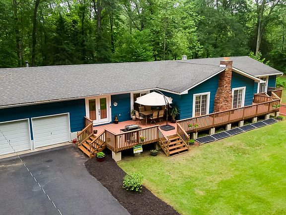 One-Floor Living on 33+ Acres with Stream, Privacy & Modern Comforts Welcome to a rare gem nestled in nature, a beautifully updated one-story home offering 3 bedrooms, 2.5 baths, and over 33 acres of pure tranquility. This property is perfect for those who crave peace, privacy, and room to roam, yet want to remain within reach of everyday conveniences. Whether you're dreaming of quiet mornings with coffee by a stream, or hosting large outdoor gatherings, this home delivers on every level. From the moment you arrive, the setting will capture your heart. A long, private driveway winds through lush landscape and leads to a 2-car garage with plenty of extra parking space for guests, RVs, or recreational vehicles. With 33.28 acres of pristine land, including woods and a serene stream, your outdoor sanctuary awaits you with hiking, stargazing, birdwatching, and peace of mind. Inside, the home is a perfect blend of rustic charm and modern elegance, all kept comfortable year-round with central air conditioning. Step into a welcoming formal living room, where rich new hardwood floors (installed in 2021) set the tone, complemented by neutral color palettes, an electric fireplace, ceiling fan, and French doors that invite in natural light and lead to the great outdoors. Adjacent, the formal dining room also features hardwood floors and makes the perfect spot for holiday dinners or everyday meals with a view. The real showstopper is the oversized great room, a space designed to impress and embrace. This massive room features a stunning floor-to-ceiling wood-burning brick fireplace that anchors the space with warmth and charm. On either side, Pella wood-framed glass doors open onto a full-length custom deck that stretches across the entire front of the home which is ideal for entertaining, relaxing, or watching wildlife in your own backyard haven. The great room also features neutral plush carpeting, new recessed overhead lighting, crown molding, and eye-catching barn-style doors that enhance the home’s cozy, country-inspired aesthetic. The kitchen, updated in 2021, is both functional and elegant, featuring new hardwood floors, crisp white cabinetry with crown molding, granite countertops, a white subway tile backsplash, and a stainless steel double sink beneath a large wood-framed window. Overhead, dual light fixtures add warmth to this inviting space. With dimensions of approximately 20' x 12', this kitchen offers plenty of room to gather with family and friends. Just off the kitchen is a private office which is ideal for working from home or transforming into a playroom, hobby space, or guest retreat. This room includes a wood-framed sliding glass door that leads directly to the deck. One of the most practical features of this home is the generously sized laundry room (approx. 12’ x 11’), complete with above-head shelving for detergents and more making laundry day convenient and organized. The primary bedroom suite is your own private getaway, highlighted by hardwood floors, beige-colored walls, crown molding, and a wood-framed sliding glass door that opens directly onto the custom deck. Imagine waking up each morning, stepping outside, and sipping coffee surrounded by the sounds of nature and stunning views. Two additional bedrooms offer great space, ample closet storage, and beautiful views of the property. The main full bath includes gray-and-white partial wall tiling, a newer white vanity with both cabinet and drawer storage, a tile-surround tub/shower combo, crown molding, and dual modern light fixtures. The second full bath features a rich oak vanity, triple-door mirrored medicine cabinet, newer lighting, a floor to ceiling ceramic tiled walk-in shower, and crown molding. Outside, the possibilities are endless. Hike your land, picnic by the stream, garden, build walking trails. A private estate that feels like a weekend getaway every day of the year. This is more than a home its a lifestyle.