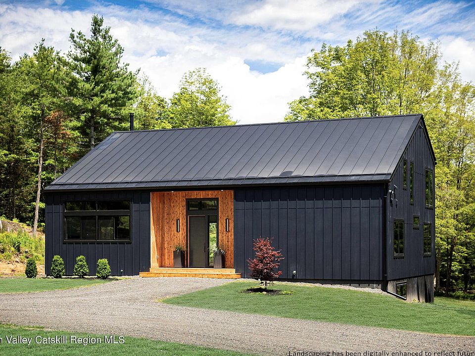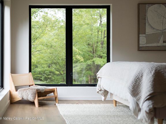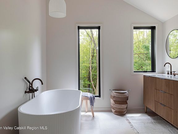 Form follows function. Nestled in the Catskills foothills, the classic exterior surprises with living spaces that expand upward with vaulted ceilings and out into nature with a curtain wall of windows opening to an expansive deck. This light-filled home takes your breath away upon entry. Hand-hewn beams reclaimed from an on-site Victorian-era barn are masterfully incorporated into the modern build, blending past and present. The lofted space above is ideal for seeking enlightenment, working out, or actually working before retiring to the primary suite with a walk-in closet and beveled tub overlooking the woods. Two bedrooms and a full bath on the first level make hosting guests easy, and a large unfinished walk-out basement offers storage or potential additional living space. Designed to maximize connection to nature, every room has perfectly positioned windows and there are multiple levels outside for soaking it all in or hosting soirees. The large deck is perfect for sun salutations, and an elevated fire pit overlooks an exterior dining area tucked into the original weathered white brick foundation. Space is allocated for a garage and/or in-ground pool. Located on the border of Accord and Kerhonkson, two sought-after hamlets in the Hudson Valley and Catskills, you'll have access to public land for hiking, biking, and skiing, as well as excellent restaurants and farmstands. This will be your bucolic full-time or part-time retreat only 88 miles from the GWB with scenic routes all the way from the bridge.