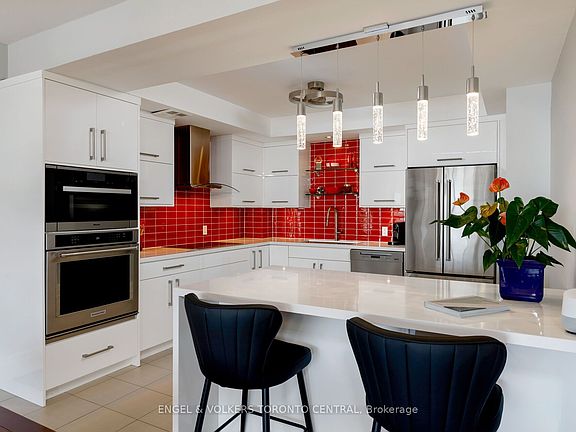 Opportunities of this distinction are truly exceptional. This two-bedroom, two-bathroom residence at the iconic Kings Landing exemplifies architectural elegance and modern sophistication, offering approximately 1,800 sq. ft of thoughtfully curated living space. Every element has been meticulously designed to capture timeless style from its clean contemporary lines to its sweeping views of Lake Ontario and Torontos shimmering waterfront.Ideally situated within the building, each room frames a breathtaking panorama of open water and sky. The formal principal spaces flow seamlessly, creating an effortless harmony between everyday living and elegant entertaining. A generous south-facing terrace extends the experience outdoors, offering uninterrupted vistas of the lake and islands.The newly designed kitchen is a showpiece of craftsmanship, showcasing premium Miele appliances and a striking waterfall center island both functional and beautifully refined.The primary suite is an indulgent retreat, featuring a spacious walk-in closet and a luxurious five-piece, spa-inspired ensuite. The second bedroom with it's B/I mercy bed is equally impressive, filled with natural light, captivating lake views, and direct access to the terrace. Completing the home are new oak floors, uniting the residence with a sense of warmth and modern sophistication.