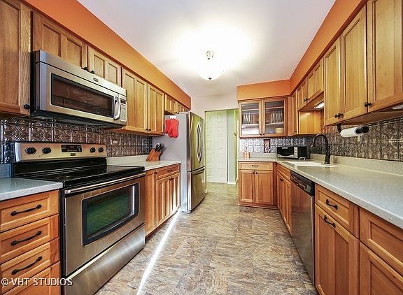 Do not miss this excellent opportunity to own this two bedroom, two bath Raintree Condo in Glen Ellyn. Special features include an extra large master suite, updated kitchen (2011) with stainless steel appliances, solid surface counters, hickory cabinets and premium vinyl floors, southern sunlight in every room, partially updated baths one with a step-in shower, great indoor, heated parking space, newer (2013) furnace and A/C, security entrance and private balcony. Coin op laundry and trash chute rooms are on the same floor, just down the hall. The Raintree community offers an outdoor pool, tennis courts, clubhouse, exercise room and socials. Nearby College of DuPage offers a wide variety of performing arts. Nestled in the heart of the Raintree subdivision you'll love the convenient access to transportation, shopping, entertainment and many parks and other outdoor venues. Sorry, no pets or FHA Financing.