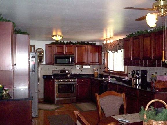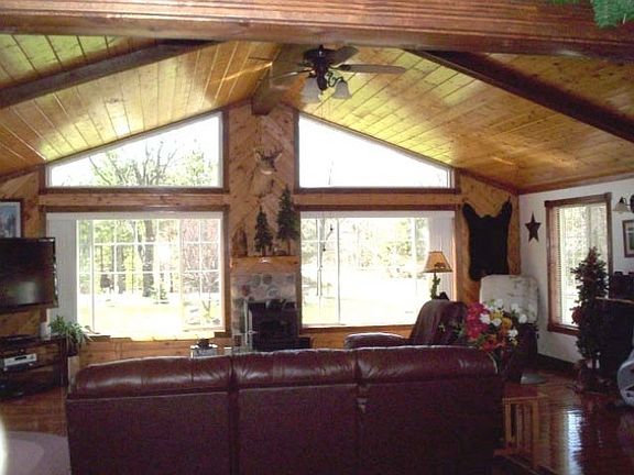 Private Paradise Found. This 3 plus bedroom, 2 bath home on 5 wooded acres offers everything on your wish list. You will love to cook in the spacious kitchen featuring high quality cabinets and solid surface countertops. Relax and stay warm and cozy by the pellet stove in the massive living room with windowed walls and vaulted knotty pine ceilings. Full finished walk out basement with 3 bonus rooms. Attached 2 car heated garage with breezeway office area. 30 by 45 pole barn.