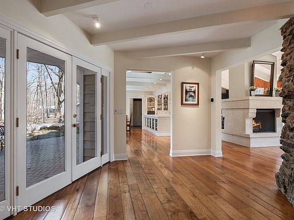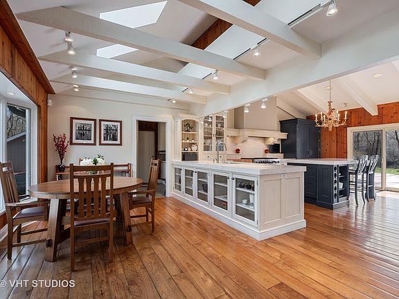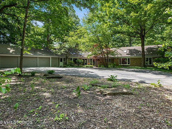 A NATURE LOVER'S DREAM provides a private & peaceful setting for this open-concept 3+bed/3.1 bath custom built ranch home set among beautiful trees. Featuring a de Giulio kitchen w/ 3"marble counters+island, Viking range, SubZero, Boos butcher block, wide-plank hickory flooring, dramatic vaulted & beamed ceilings + dual sided fireplace which opens to the expansive great room. Each room boasts stunning views bringing the outdoor beauty inside, w/ floor-to-ceiling windows. Foyer w/dramatic stone wall. Master suite w/newly remodeled master bath w/dbl vanity, granite counters, XL marble walk-in shower, private deck & adjacent sunroom/office/sitting room with 20+ ft cathedral ceiling overlooking the wooded property. 2 de Giulio full baths w/marble counters. 3+car heated garage, huge high attic. New AC & furnace. Nationally Ranked Deerfield schools. Five glorious wooded acres of country living yet 5 mins to hwy, 10 mins to train lines & 20 mins to O'Hare. ASK FOR LIST OF IMPROVEMENTS!