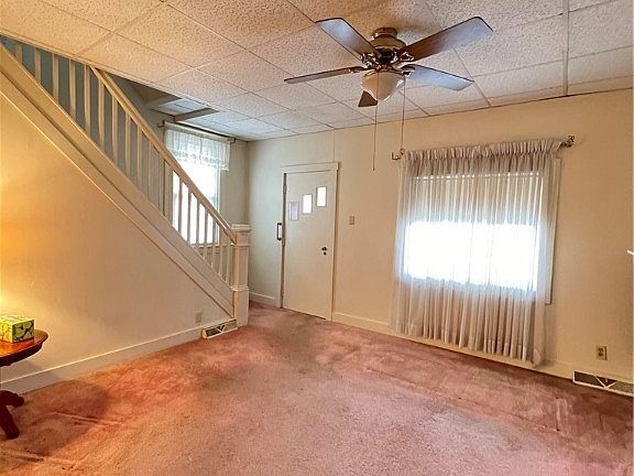 Charming Vinyl Sided 2 Story, 3 Bedroom, 1.5 Bath home begins with a front covered entrance to open floor plan livingroom dining room and kitchen, straight thru to mud room that opens to fenced in back yard with side drive way for 3 plus off street parking. Upper level full bathroom, 3 bedrooms, Well maintained home with gas stove, refrigerator, washer dryer, basement bathroom area. level yard with garden area for your personal planting desires. Newer hot water tank, furnace.