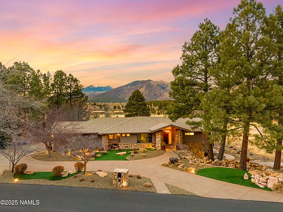 From the moment you walk through the front door, you're greeted by incredible, floor-to-ceiling views of Mt. Elden, a sight that never gets old. Set on 1.4 acres, backing directly to Foxglenn Park, this fully furnished, recently updated home is a blend of seclusion, luxury, and adventure. With no possibility of a home being built next door, your slice of Flagstaff paradise is protected for years to come. Inside, wooden ceilings stretch throughout, adding warmth and character to every space. The kitchen features a sleek stainless steel vent hood, Sub-Zero wine fridge, and stunning granite countertops. The floor plan offers two bedrooms upstairs, two downstairs, plus a potential fifth bedroom, creating flexibility for any lifestyle. The spa-inspired primary bathroom has been completely transformed, featuring a walk-in shower with dual shower heads, a luxurious soaking tub, heated floors, and elegant custom finishes for a true experience. Throughout the home, wood floors, a water softener, a security system, light timers, a plethora of storage, and smart home features enhance both style and functionality. Thoughtful upgrades throughout the home, including new carpeting, fresh interior and exterior paint, an upgraded furnace and A/C, Nest thermostats, an EV charger outlet, and a revitalized jacuzzi. The three-car garage is designed for convenience, with the third bay fully heated and cooled for year-round use.