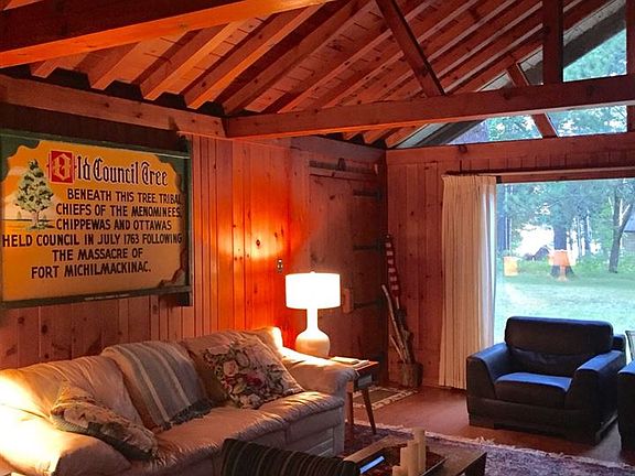 387' of sandy Lake Michigan beach frontage along with 20 beautifully wooded acres of land creates the perfect setting for an "Up North" getaway. The charming and rustic main cabin features two bedrooms, 2 new baths, updated kitchen, beamed ceilings, and stone fireplace. An additional guest cabin offers living area with kitchenette, bedroom and full bath. A third cabin garage complete the property. Great rental with strong rental history. Site of the "Council Tree" and rich in Northern Mich. history.