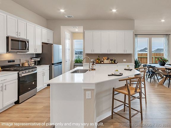 The Kingston is a single story home that offers 4 bedrooms, 2 bathrooms and 2,031 sq. ft. of living space. As you enter the inviting foyer, you'll pass three secondary bedrooms, as well as the secondary bathroom. You'll next enter the open concept kitchen which features stainless steel appliances, quartz countertops, and classic subway tile backsplash. The oversized kitchen island offers a deep, single bowl sink and extra countertop space. The dining area flows into the living room, which has plenty of natural lighting and leads to a large covered back patio. The private main bedroom suite is located off the living room and features double vanity sinks, a huge walk-in closet and large walk-in shower with 12x24 tile surround. Additional features include natural gas, luxury vinyl flooring at entry, downstairs, halls, living room, kitchen, and dining/breakfast area and utility room, tile in all bathrooms, faux wood window blinds, and front yard landscaping. The Kingston includes our HOME IS CONNECTED Smart Home base package which includes an Amazon Dot, Front Doorbell Camera, Front Door Deadbolt Lock, Home Hub, Light Switch, and Thermostat.