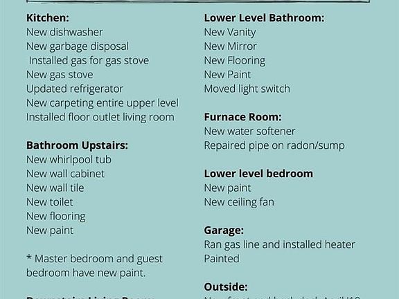 - Equipment: Microwave Oven, Refrigerator, Smoke Detector, Garage Door Opener, Dishwasher, Disposal, Stove Hood, Gas Oven/Range, Ceiling Fans, Sump Pump, Whirlpool Tub, Sound System