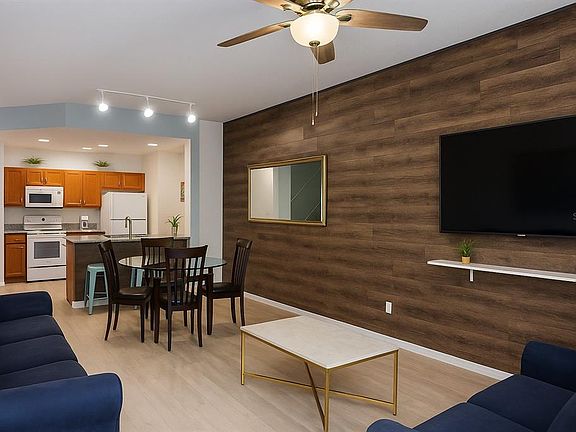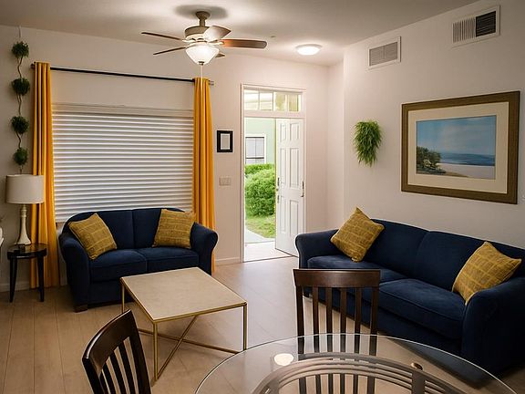 Renovated, furnished, resort-style amenities just steps from Disney. Set within the gated Villas at Seven Dwarfs, this turnkey townhome is offered for rent and blends everyday comfort with vacation-style living. The flexible layout features one bedroom on the main level with additional bedrooms upstairs for privacy and ease. Recent updates include a brand-new community roof replacement and a 2021 A/C unit, while wood-look laminate in living and dining areas, stairs, hallways, and bedrooms pairs with tile in the kitchen and baths for durability and low maintenance. The remodeled kitchen shines with granite countertops and updated appliances, opening to a welcoming living and dining space that's perfect for relaxing after a day at the parks. Fully furnished and stocked with essentials refrigerator, range, microwave, dishwasher, washer, and dryer this residence is ready for immediate enjoyment. Step out to a full slate of resort amenities: a sparkling pool, splash pad, tiki bar, fitness center, and game areas, plus tennis, basketball, and sand volleyball courts, an outdoor Code Playground, and tranquil water views. Rent includes community services such as internet, exterior pest control, and lawn maintenance for a simpler lifestyle. Located close to restaurants, shopping, groceries, and major highways, and just minutes from world-class theme parks, this home places you at the center of convenience and fun. Experience comfort, convenience, and a resort-style setting request your private tour and secure your lease today.