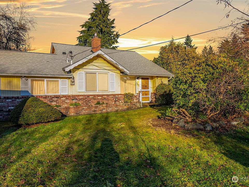 Timelessly charming 1961 home with a striking blend of brick and wood, ripe for renovation. This two-story tri-level gem on a spacious 10,890 sq. ft corner lot features 3 beds and 1.25 baths. Unique features include a luxurious two-headed jetted tub in the full bathroom, and bonus upstairs space for your retreat. The stone-surrounded wood-burning fireplace and a free-standing stove add character and comfort to your space. The hardwood floors are restorable, and the roof shows minimal wear. The massive covered patio opens to a vast backyard and access to the 2-car detached garage. Prime location near parks, town, Alderwood Shopping District, I-5, and the new Light Rail. Transform this diamond in the rough into your dream home!