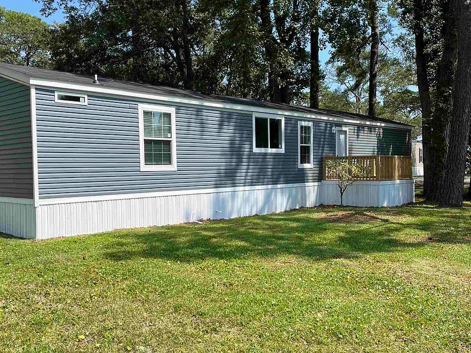 This beautiful new 3 bedroom 2 bath manufactured home is set up in the sought after Creekside North Myrtle Beach community that offers amenities to include a pool, clubhouse, playground, and community mail boxes. Creekside is a leased lot community where manufactured home owners reside close to the Atlantic Ocean and Intracoastal waterway. The decks on the front and rear of the home are great for relaxation and entertaining. The home is being finished off with vinyl under skirting once power is obtained in the next week or so and will provide protection for the crawl space foundation and give a splash of additional curb appeal. As you enter the home, you walk into the living room, and to your left is the open kitchen with plenty of shelves and an island kitchen bar. The home has a split bedroom plan with master walk in closet and double sinks. The farmhouse kitchen sink is lovely and has plenty of space. A manufacturer's home warranty is being offered to the buyer. This lovely charmer is a must see today.