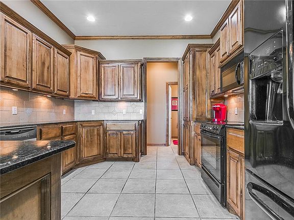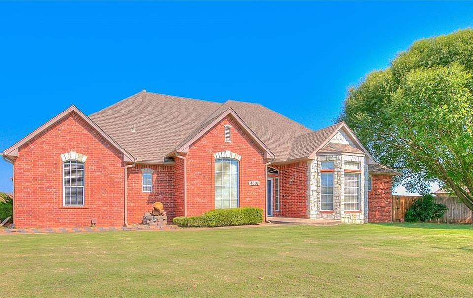 Want an acreage in the city? Want a gated family friendly community? How about a pool with a waterslide? This 3bd/2.5bth/office/3 car garage home is a rare find in the Twin Lakes Addition. You'll fall in love with this robust space that is great for entertaining family & friends. Sitting on 1.11 acres, this home features beautiful woodwork, big rooms, high ceilings, and an open floor plan. Perfect kitchen with lots of storage, granite counter tops, and bar seating. Plenty of large windows & doors throughout this home look out at the beautiful view of the pool, impressive covered patio, massive yard, and pond behind the property. The oversized master suite has room for a sitting area, spa like master bath, and large closet with built-ins. In this lovely home, you'll also find a dedicated office, a formal dining, a half bath for guests, and a split floor plan for privacy. The roomy secondary bedrooms share a Jack-n-Jill bathroom. Easy access to I-35, Tinker, and Norman. Moore Schools!