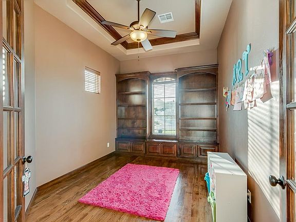 Beautiful custom home located with in walking distance to the highly rated Cross timbers Elementary school. This home features a large open living area with a cathedral ceiling, custom wood beams and hard wood floors. The kitchen is unbelievable for cooks with many custom features. The large study has beautiful built in cabinets and hard wood floor. The Large master bedroom has accent lighting and ceiling fan and with a large walk in closet with built in custom drawers. The 2 additional bedrooms are spacious each having their own sink area sharing a jack and jill bath. The utility room features extra storage and counter space. Home includes a large 4th bedroom or bonus with full bath. Custom cabinetry for storage throughout the home. It has a wonderful back yard and the patio features a covered area with a fireplace and additional open patio. Storm shelter included! Please notice photos for more details. The neighborhood has pool, play areas, and walking trails.