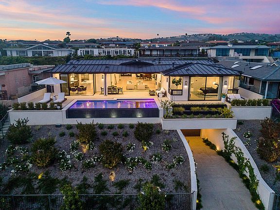 Located on one of the desirable terraced streets in Corona del Mars Cameo Shores enclave, this sprawling custom masterpiece showcases a brand-new thorough reimagining with a gorgeous backdrop of ocean, sunset and Catalina Island views. Built from the ground up in 2015, the soft-contemporary residence is now graced with todays most fashionable finishes and coveted appointments, including Calacatta marble surfaces, white oak wood flooring, a wine wall in the formal dining room, Venetian plaster walls, Phillip Jeffries wall treatments, an elevator, and walls of glass that slide away, leading the way to the outdoors. A spacious terrace is centered around a vanishing-edge pool and spa and features a heated loggia and endless vistas. Open and inviting, the 5-bedroom, 7-bath home spans approx. 8,400 s.f. over two levels. Enjoy a foyer with glass and wood entry door, wide-open rooms, a great room with sleek fireplace and built-ins, and a new kitchen with prep kitchen, custom cabinetry, a double-waterfall island, tile backsplash, two casual dining areas, and high-end appliances including a Wolf range, dual dishwashers and a built-in refrigerator. All baths have been upgraded, and the master suite is distinguished by terrace access, a linear fireplace, a sit-down vanity, and stunning closets including a backlit shoe closet. Windows to a courtyard illuminate a subterranean level with 8-car garage, a lounge, full club-style wet bar, game room, and a state-of-the-art theater.