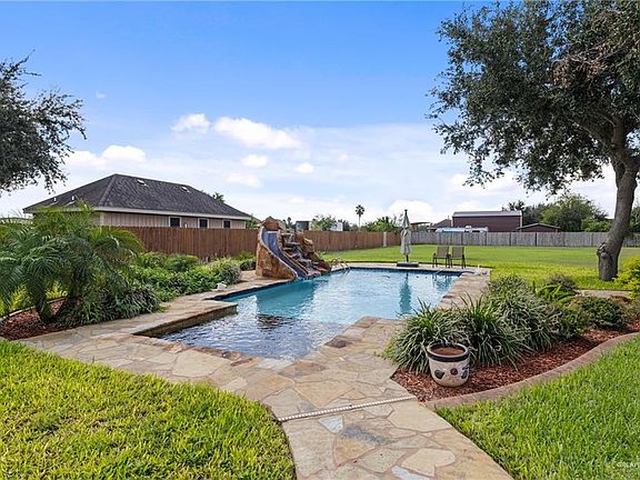 Welcome to this beautiful 4-bedroom, 3-bathroom home set on a full 1-acre lot in Edinburg, Texas. The open-concept layout features a spacious living and dining area, tile flooring throughout, and plantation shutters that fill the home with natural light. The kitchen offers custom wood cabinetry, granite countertops, a center island, and stainless steel appliances, while a wet bar enhances the space for entertaining. The primary suite is generously sized, and the additional bedrooms provide plenty of space for family or guests. Outdoors, enjoy a sparkling pool, rock waterfall, and waterslide surrounded by mature landscaping. A covered outdoor kitchen creates the perfect setting for gatherings. Additional features include mature trees, a gated entry, and an extended driveway with ample parking. Conveniently located off University Drive, this property combines privacy with easy access to schools, shopping, and dining. Don’t miss the opportunity to make this one-acre estate your home.