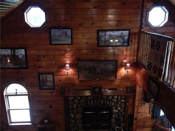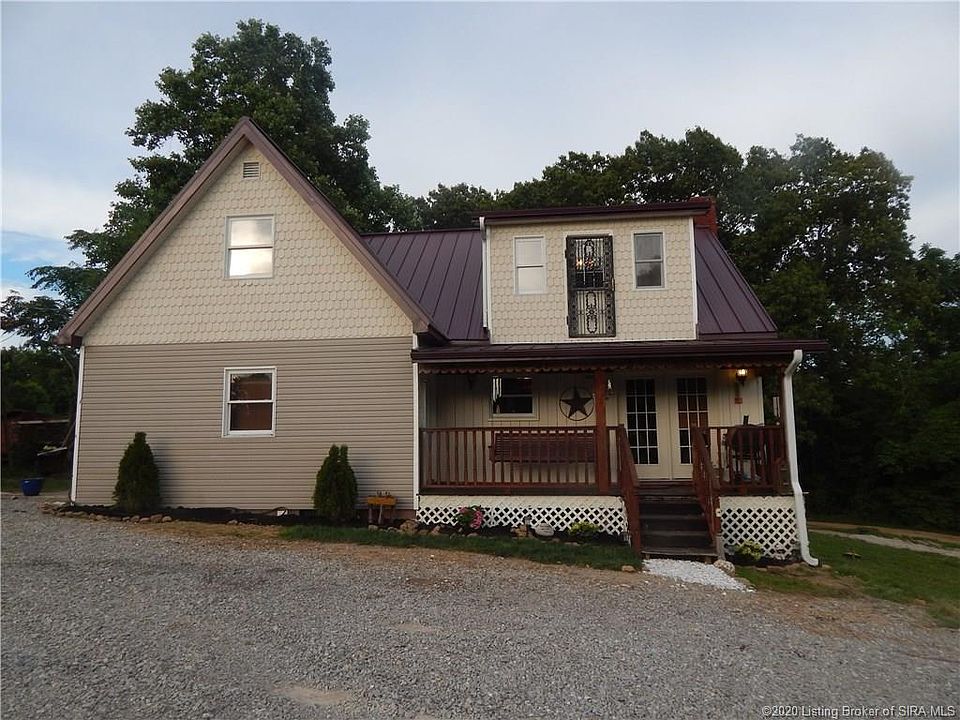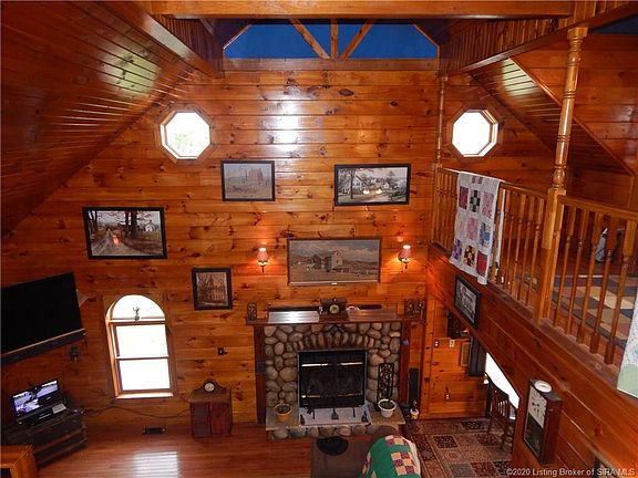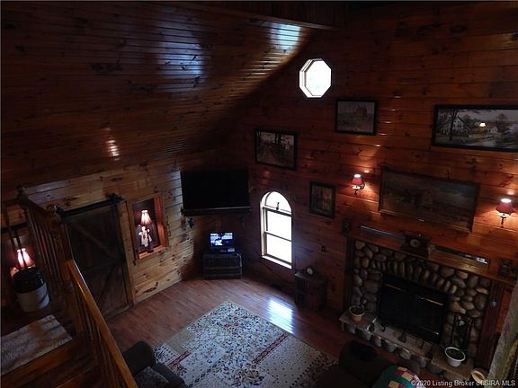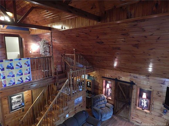 When you walk up on the cozy covered front porch and enter this home, you will be completely awestruck!!! You will feel you have just stepped into a lodge at a state or national park! But you can have it all for yourself on this 1 acre lot, a short distance from Marengo! Located 30 minutes from Patoka and close to Hoosier National Forest, great hunting and fishing all around you! Pictures of this property speak for themselves! Home offers 2 bedrooms and 1 full bath on the first floor and 2 bedrooms and 1 full bath on the second floor. Second floor balcony which overlooks the spacious great room would make an ideal area for a home office or just a quiet place to read a book! Very convenient kitchen has an opening to the great room so that whoever ends up with kitchen detail will not be excluded from the activities of the great room. Oak cabinets and a tin backsplash give the kitchen that country flare. Refrigerator, stove and dishwasher will remain. Utility room offers a great spot for doing laundry and offers additional storage. Mud room includes storage for odds and ends. Looking for a place to store vintage cars, four-wheelers, boats, etc. or pursue your favorite hobby, this property also has a 24' x 40' garage with two access doors, one a sliding door and one, a standard garage door, You'll benefit from the brand new carpet in the master bedroom, new flooring in the kitchen and first floor bath and the just-installed barn door leading from the lodge room to the mud room.