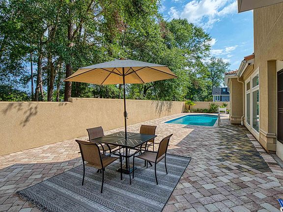 This custom-designed Mediterranean home is located in a quiet circle just blocks away from the beach and Barefoot Landing, making it a rare find due to its desirable location and the absence of a homeowners association. The house boasts a large pool, four car garage, impressive curb appeal with beautiful landscaping, a well-built privacy wall, and a circular driveway. Numerous appointments and features enhance the overall appeal of the property, which can only be fully appreciated as you explore further. The completely remodeled kitchen features stainless steel appliances, new cabinets, and granite countertops. The breakfast bar provides a convenient spot for casual dining or socializing while cooking, and the open layout creates a spacious and inviting atmosphere, perfect for entertaining guests. Additionally, the large pantry ensures ample storage space. Outside, you'll notice hidden exterior lighting, cart paths leading to the rear of the property, and Juliet balconies, among other details. Stepping into the front foyer, the open layout immediately draws you in. To the right, there's a flex room that can serve as an office, den, bedroom, or media room—perfect for personalized use. Across the foyer, you'll find the formal dining room surrounded by arches and columns, seamlessly connected to the kitchen and great room. This main floor is designed to encourage inclusion, with a flow from one room to another. Adjacent to the kitchen is a screened porch with all season windows, providing a serene outdoor space to enjoy year round. Continuing through the home, you'll come across a powder room off the living room. Further along, you'll reach a hallway that splits in two directions. To the left is the laundry room, which connects to the owner’s bath. Going right takes you directly into the owner's suite. This private retreat spans the entire end of the home and the bathroom is thoughtfully designed featuring double vanities, a jetted tub, and a large custom shower. The four car garage gives you plenty of room for your vehicles and additional storage space for tools, equipment, or other belongings. There is even a golf cart door on the side of the garage for easy access. Upstairs there is a large landing area that provides access to both bedrooms and a spacious guest bath. Both bedrooms are very large with the bedroom to the left you'll discover a private balcony overlooking the backyard, and two massive walk in closets. Throughout the home, you'll find exquisite details such as two-piece crown molding, large trim work, and impeccable fit and finish. Attention has been given not only to the visible elements but also to the hidden aspects. The entire home is equipped with a Vanguard water system, and extra insulation in the walls helps contain sound. SafetyShield protects the large windows. Marion Circle in the Windy Hill section of North Myrtle Beach offers an array of beautiful homes, privacy, scenic views, and excellent amenities nearby. This is an opportunity to own your dream home with features that exceed your expectations. Take a tour of the property to experience it firsthand, and make plans to see why this home should be yours. All information is deemed reliable but not guaranteed. Buyer responsible for verification.