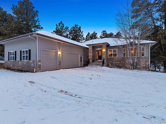 Peacefully tucked back amidst 6 lush acres of rolling hills and majestic pine, this magnificent walk out ranch complete with an oversized 3-car attached garage AND a 4-car detached garage is the epitome of Colorado living! Step inside where you will be greeted with soaring vaulted ceilings, a wide open floor plan, a charismatic floor to ceiling wood burning fireplace, oversized picture and bay windows, a spacious formal dining room connected to the large eat in kitchen offering stainless steel appliances, breakfast bar, and a sun drenched nook that overlooks the backyards natural Colorado landscape! An airy and enticing main floor master suite grants outdoor access to the covered patio, an attached 5-piece master bath, walk in closet, and copious amounts of natural light! A finished walk out basement with 4 large bedrooms (sub office/studio/craft room/etc), a 2nd family room, a beautifully remodeled full bathroom, AND ample storage space. Just 15 minutes to downtown Elizabeth yet a world away from the chaos of life!