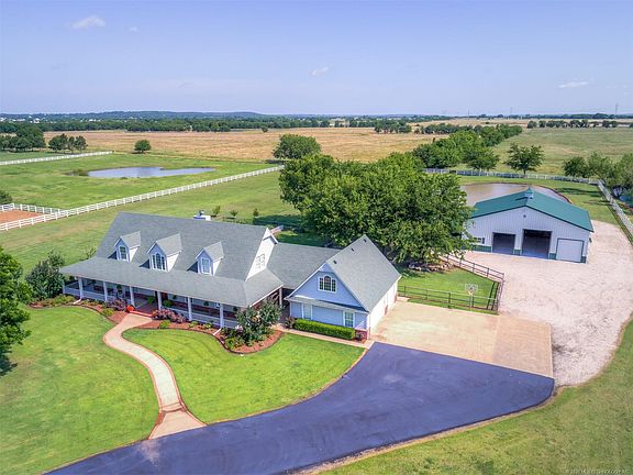 Warm and welcoming southern charmer with wrap around porch situated on 5 acres including 2 ponds & vinyl 3 rail fence. Spacious living perfect for gathering with friends & family. Home features vaulted ceilings, custom wood beams, & large windows w/ abundance of light. Open floor plan, 3 beds down, 1 bed up, game room + bonus space. 2700 sq ft MORTON shop, veggie garden, fruit trees, gated entry. Bixby Schools