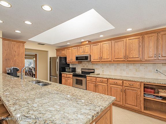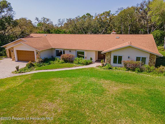 An incredible opportunity awaits you with this stunning custom-built ranch-style home! Featuring 5 spacious bedrooms, 4 large bathrooms, and a 3-car garage, this magnificent property is located in the coveted manned/guard-gated community of Lake in the Woods. Situated on over half an acre of land, the property boasts a serene, wooded backyard, home to an abundance of wildlife. Upon entry through the gorgeous double doors, you'll be greeted by a grand foyer leading to a formal living room and a large family room with a stunning stone wood-burning fireplace flanked by built-in bookcases. This home offers an open floor plan with over 3610 sq ft of living space and a 30x60 sq ft screened lanai with a 16x32 sq ft pool, perfect for entertaining and family fun. Recently resurfaced and featuring a new pump and filter, the pool and lanai are sure to impress. The Galley Kitchen is spacious and provides stainless steel appliances, with a skylight in the kitchen and bathrooms, and wide windows that flood the home with natural light. The ceramic 16x16 tile flooring flows throughout most of the home with hardwood and laminate in the bedrooms - no carpet! A large laundry room and pantry with utility sink, and a whole house vacuum system installed in 2018 provide additional convenience. This exceptional property has undergone settlement remediation in 2003 with an Engineer's report and is fully insurable. Located close to shopping, hospitals, restaurants, parks, and nature preserves, including Pine Island and Weeki Wachee Preserve and State Park, this home offers the perfect blend of luxury and convenience. Visit www.litwoods.com for more information about this incredible community. Don't miss out on this fantastic opportunity - schedule your private viewing today and experience the ultimate in Florida living!