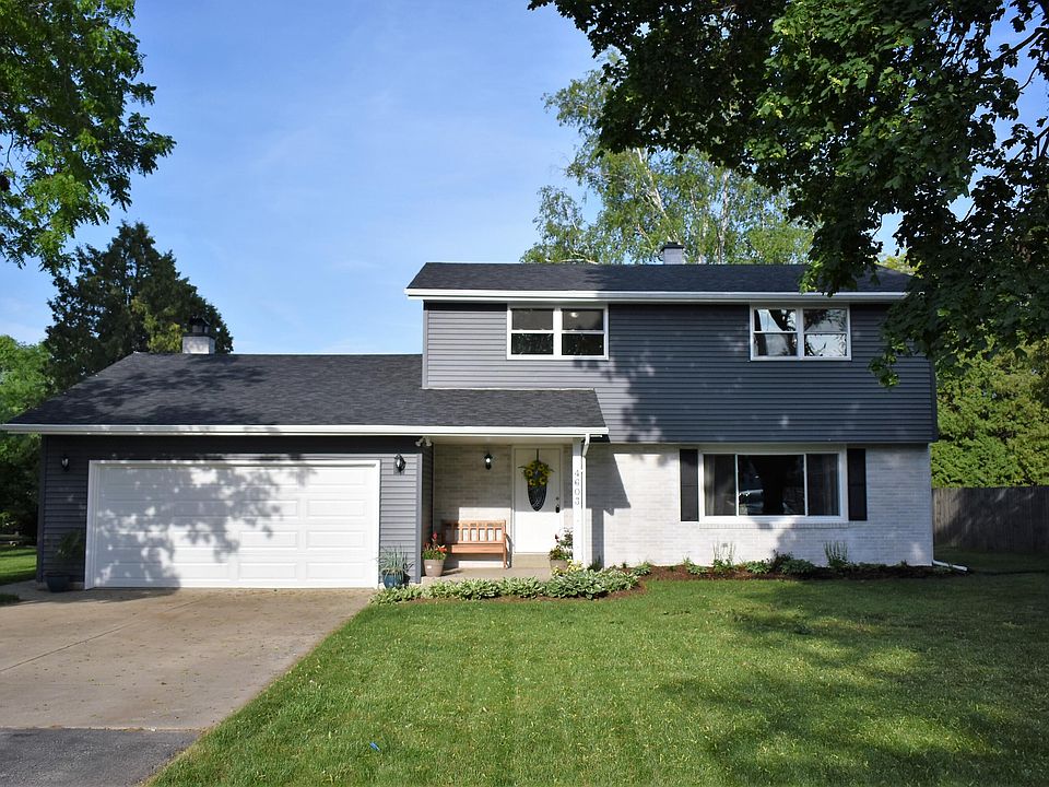 Spectacular updates and ultimate style converge upon this striking remodeled Caledonia colonial! This home boasts a chic all new kitchen complete with new stainless steel appliances, elegant quartz counters, moveable island; bench seating, and convenient coffee station; a cheery dining and living room; family room with soaring vaulted ceiling and natural fireplace; and rec room area in the lower level. Upstairs features a spacious primary bedroom w/private full bath and walk-in closet, a sharp remodeled full bath, and two other bedrooms. A half bath and laundry room round out the main floor. Enjoy the outdoors from the patio overlooking a large backyard. New roof, new windows, new siding, and fresh paint and flooring are already done. This is a beautiful home, see today!