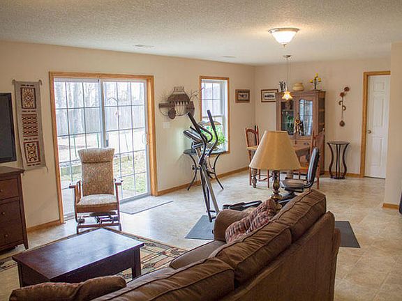 Custom built ranch walkout, Truss construction so no load bearing walls inside! Open floor plan, hardwood floors in kitchen and dining room, gas log fireplace in vaulted great room with a beautiful view of the heavily wooded back yard. JohnDeere doors in downstairs workshop, oversized patio with privacy fenced park like backyard.