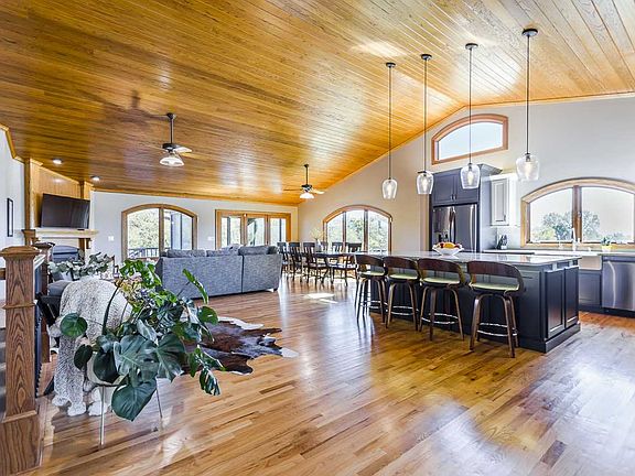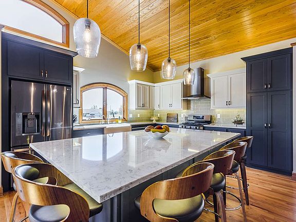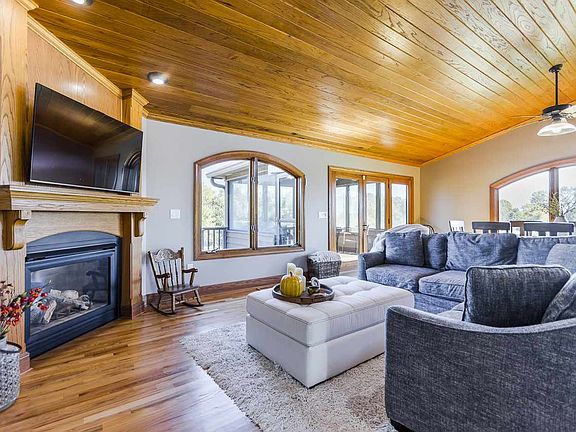 Completely unique and tastefully finished, this one-of-a-kind stately ranch is settled on an over 3 acre private lot with the convenience of paved roads. The soaring vaulted wood-planked ceilings and stunning gourmet kitchen are the first of many show stopping elements you will find as you walk in. Featuring contrasting colored custom cabinetry, high end LG appliances, farmhouse porcelain sink, massive island with seating for six, stunning quartz countertops, tastefully chosen under counter/island lighting, this kitchen has it all with no detail spared. This space was made for entertaining with endless seating capabilities, separate dining area, and a lovely screened deck area to take in the view of the private back yard and pond. Expansive main floor master suite with double sided gas fireplace, HUGE master bath with walk in double head shower, jetted tub, dual sinks, and massive walk in closet. Walk-out basement boasts 3 additional bedrooms, living room, bath, and ample storage