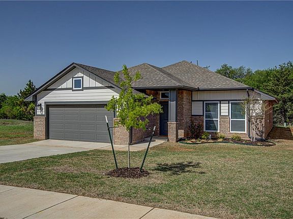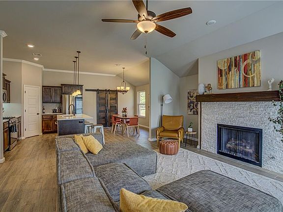 Look no further than this beautiful newer construction home in Eagle Cliff, conveniently located in the Norman school district, close to OU and easy access to I-35! An open-concept floor plan greets you as you walk inside, with wood look ceramic tile floors throughout the common areas and the spacious living area with a stunning gas log fireplace. The functional kitchen boasts quartz countertops, a large eat-in island, under cabinet lighting, stainless appliances with a 5-burner gas range and pantry. An additional flex space just beyond the barn doors can be utilized as second living or office, with access to the backyard. Retreat to your primary suite, complete with vaulted tray ceiling, ensuite bathroom with double vanity with quartz countertops, garden tub, luxurious walk-in doorless shower and huge walk-in closet. The secondary bedrooms are great sized. Dedicated utility room features built ins for great storage. Welcome home!