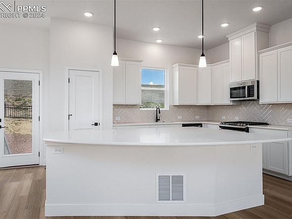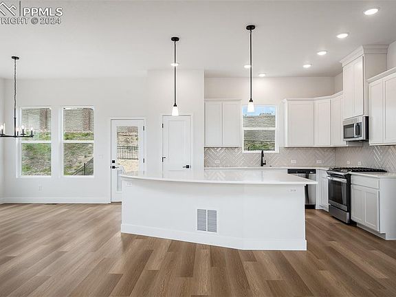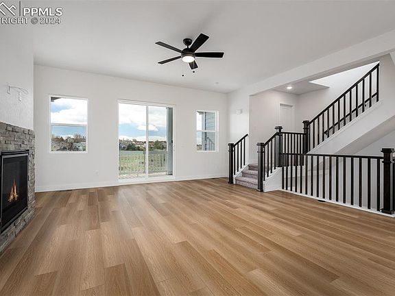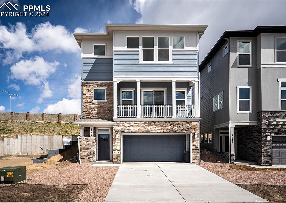 Experience the epitome of luxury living in Trailside at Cottonwood Creek with this exquisite Alpine home. Nestled within a gated community and zoned for D20 schools, this residence offers a coveted blend of exclusivity and convenience, coupled with breathtaking views of Pikes Peak. Step onto the covered front porch and be enveloped in timeless summer comforts, setting the tone for relaxation and tranquility. Indulge in the splendor of sunsets over the Front Range and Pikes Peak or savor your morning coffee amidst the crisp mountain air. Upon entering, the downstairs retreat with a half bath presents endless possibilities – from a welcoming den to a refined library or a dreamy family movie theater. Upstairs, the elegant yet low-maintenance LVP flooring, lofty 10-foot ceilings, and expansive, energy-efficient windows bathe the open-concept living spaces in natural light. The spacious kitchen island overlooks the inviting family and dining areas, leading seamlessly to the charming south-facing balcony. Craft culinary delights in the tastefully appointed kitchen boasting 42-inch-tall upper cabinets with crown molding, a top-tier gas range, and centennial quartz countertops. Retreat to the upstairs Owner’s Retreat, complete with an eon suite bathroom featuring a walk-in shower and a generously sized walk-in closet. Completing the top floor are two additional bedrooms, a full bath, and convenient laundry facilities. Embrace the outdoors with ease on the extensive Cottonwood Creek Trail system, seamlessly connected by a bridge right from the community.